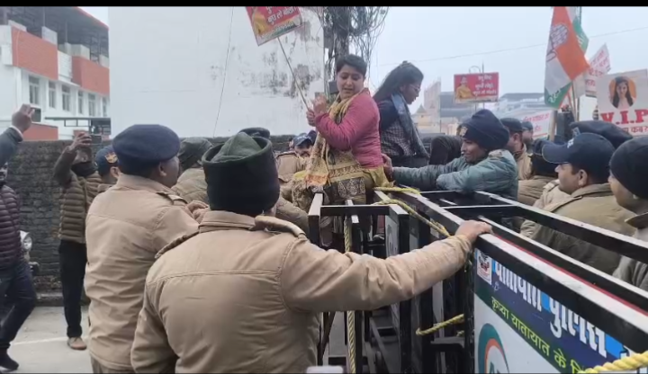 ऋषिकेश _ अभिनेत्री उर्मिला के सोशलमडिया पर आए वीडियो के बाद उत्तराखंड की राजनीति में लगातार विपक्षी दल बीजेपी सरकार पर दबाव बनाए हुए हैं और लगातार वीआईपी के खिलाफ सीबीआई जांच की माँग के साथ-साथ सख्त कदम उठाने की माँग कर रहे है की जिसको लेकर आज उत्तराखंड में विपक्षी पार्टीयों के द्वारा पदयात्रा का आयोजन किया गया अंकिता भंडारी हत्याकांड में विआईपी के नाम को लेकर विपक्ष लगातार भाजपा पर तीखा वार कर रहा है। इसी को लेकर ऋषिकेश में कांग्रेस प्रदेश अध्यक्ष ज्योति रौतेला के नेतृत्व में यम्केश्वर विधायक रेनू बिष्ट के घर का घेराव कर प्रदर्शन किया। बड़ी संख्या में महिला कांग्रेस कार्यकर्ति मौजूद रही। इस दौरान भारी पुलिस बल तैनात रहा